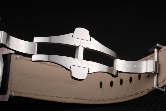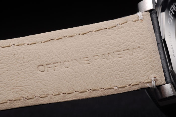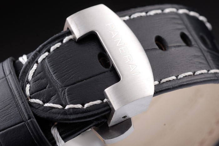 Bracelet stål: Svart krokodil läderrem med vita sömmar och värme präglade Officine Panerai Italien stämpel och polerat rostfritt stål utfällbara i krok lås
