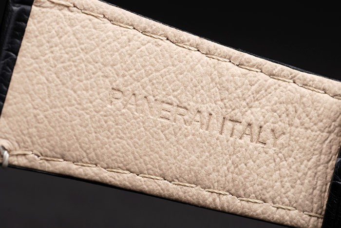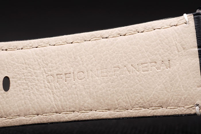 Bracelet: Svart krokodilläderband med vita sömmar och värme präglade Officine Panerai Italien stämpel och jon-klädd krok spänne spänne med Panerai engraving