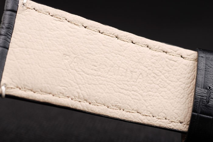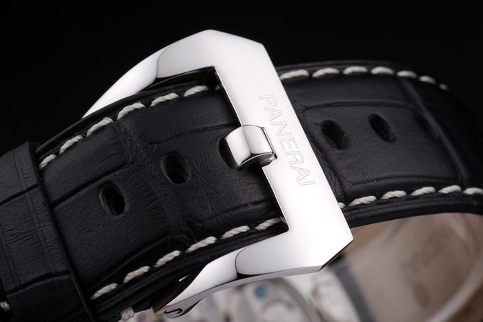 Bracelet rostfritt stål: Svart krokodilläderband med vita sömmar och värme präglade Officine Panerai Italien stämpel och polerat rostfritt stål krok spänne spänne med Panerai engraving