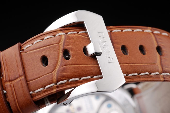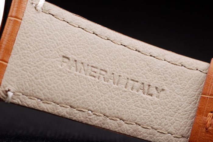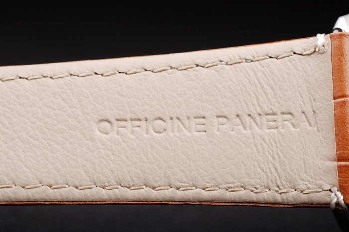 Bracelet: Brun krokodil läderrem med vita sömmar och värme präglade Officine Panerai Italien stämpel och polerat rostfritt stål krok spänne spänne med Panerai engraving