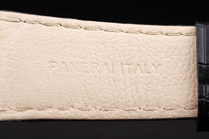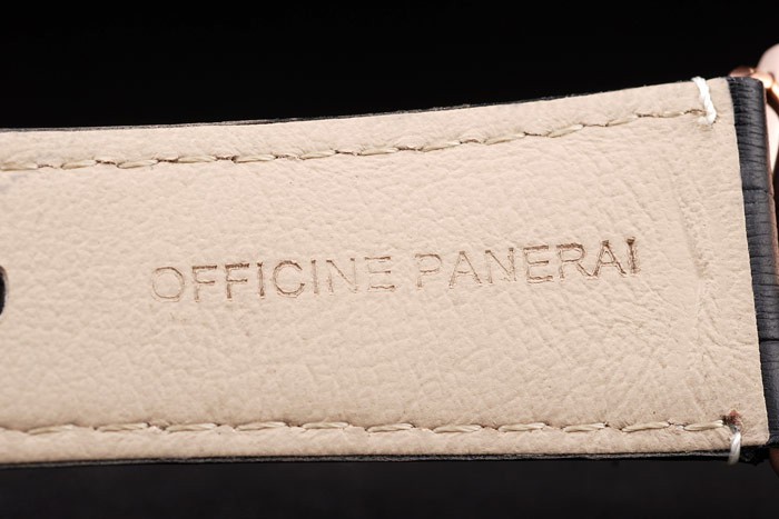 Bracelet: Svart krokodilläderband med vita sömmar och värme präglade Officine Panerai Italien stämpel och 18k steg-guldpläterade krok spänne spänne med Panerai engraving