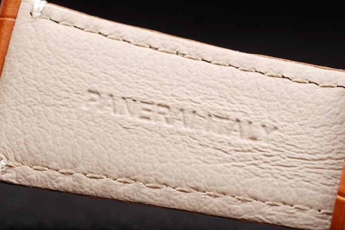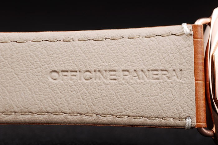 Bracelet: Brun krokodil läderrem med vita sömmar och värme präglade Officine Panerai Italien stämpel och 18k steg-guldpläterade krok spänne spänne med Panerai engraving