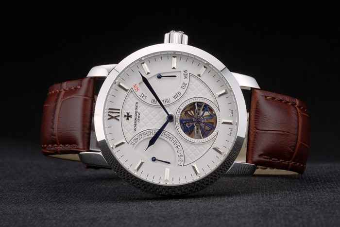 Tillbaka: Polerat rostfritt stål snap-in tillbaka med Vacheron Constantin gravyrer och transparenta mekanik avslöjar center