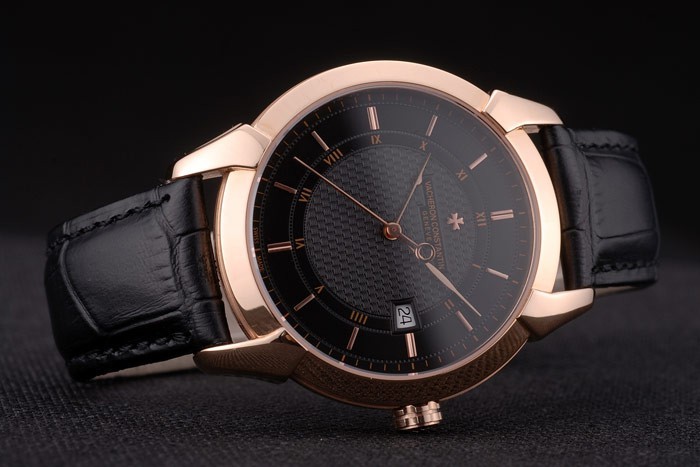 Bracelet: Heat präglade Vacheron Constantin och logotyp svart krokodil läderrem med 18k Rose- guldpläterad logo krok spänne clasp