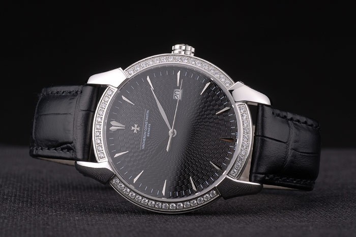 Bracelet: Heat präglade Vacheron Constantin och logotyp svart krokodil läderrem med polerat rostfritt stål logo krok -buckle clasp