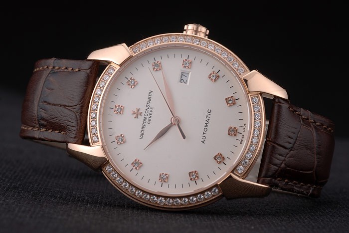 Bracelet: Heat präglade Vacheron Constantin logotyp och brunt krokodilläderband med 18k Rose- guldpläterad logo krok spänne clasp