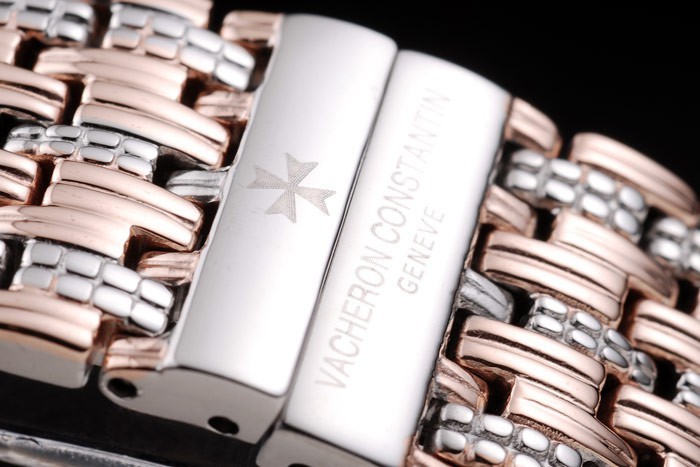 Bracelet rostfritt stål: Polerat rostfritt stål och 18k steg-guldpläterade cutwork länk armband inskrivet med Vacheron Constantin tryckfrigör dold clasp