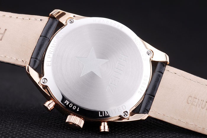 Crown: Rose-guldpläterad cutwork krona med Zenith stjärna logotyp gravyr och två mindre runda tryckknapps kronor på ömse sidor av it
